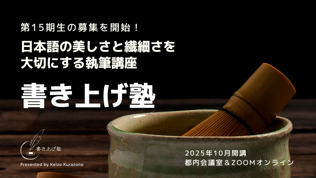 おもしろいことに、一周まわってこれが最先端のスキルになるかもしれません。 あなたが日本語に強い興味と魅力を感じているなら、ぜひ書き上げ塾でそのかけがえのないセンスを磨いてください。